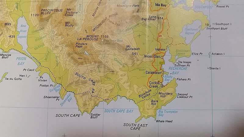 Above, the southeast corner of Tasmania. The red line is the road. The dotted black line is the walking track.