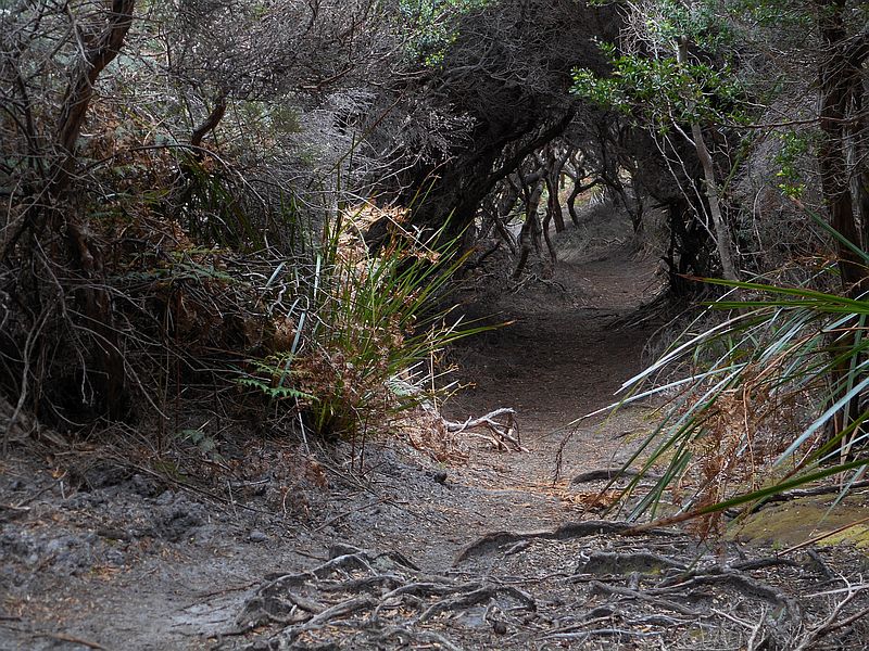 As the track approaches the coast, it encounters ancient and steep sand dunes, now thickly vegetated. The path through the dense vegetation forms a dark tunnel.