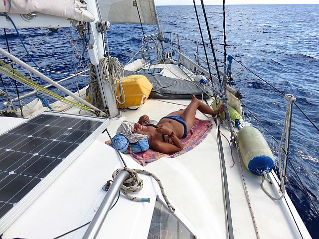 Here we have just left Fiji from the Vuda Marina, which is a port of entry/exit. Days were hot, but the evenings were cooler. Just before sunset, crew prepare for the night west of Fiji.