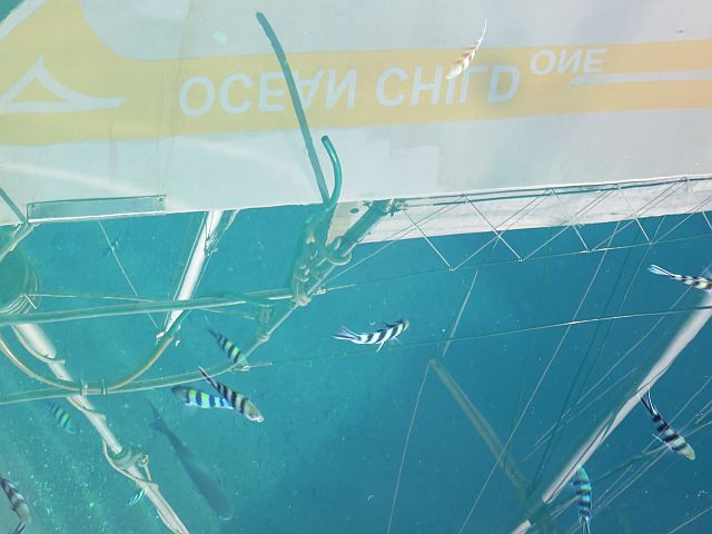 We had a welcoming committee of small reef sharks. I had expected crystal clear water and lots of live coral, but in fact almost all the coral at our location was dead, with lots of algae, and the water visibility was only about 20 m. Water temperature was 26 degrees C.
