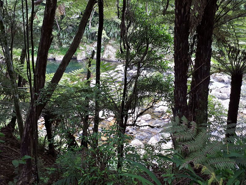 The range of hills to the north of Waihi still retains large areas of native forest, although generally without the original trees (especially Kauri) which were harvested for timber. There are many walking tracks, often beside beautiful streams, like this one.