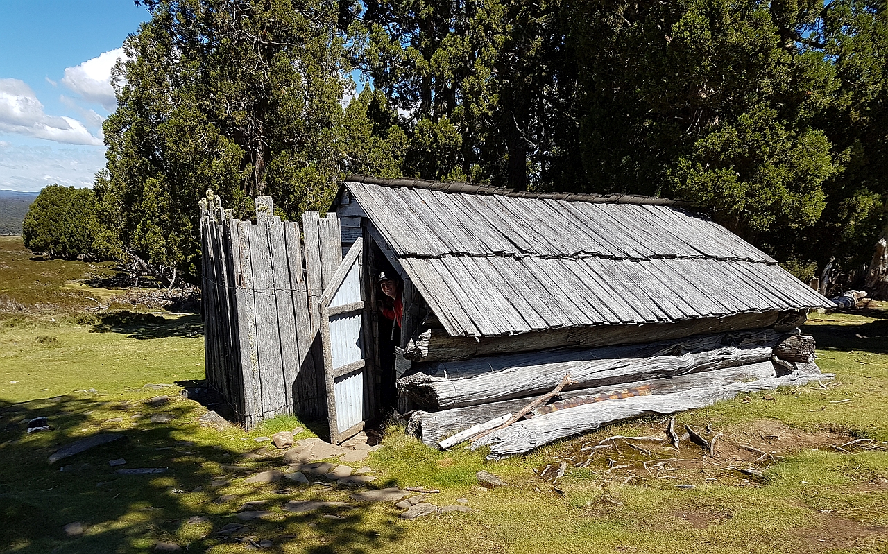 The hut at Dixon's Kingdom. Dixon's Kingdom is like a tiny paradise, a lost world. Very old pine trees and 'marsupial lawns'. On a sunny day, a feeling of peace and beauty. There are no tent platforms, and no tapped water supply, however there is a toilet.