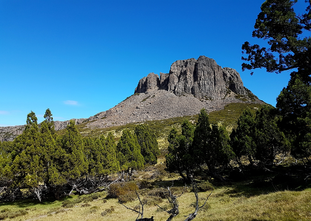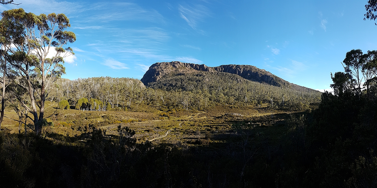 Wild Dog Creek lies just north (this side) of King David's Peak. Photo: Karla Morales. The elevation of the plateau is around 1000m, while the dolerite intrusions, like King David's Peak (above) rise another 300 - 400 m.