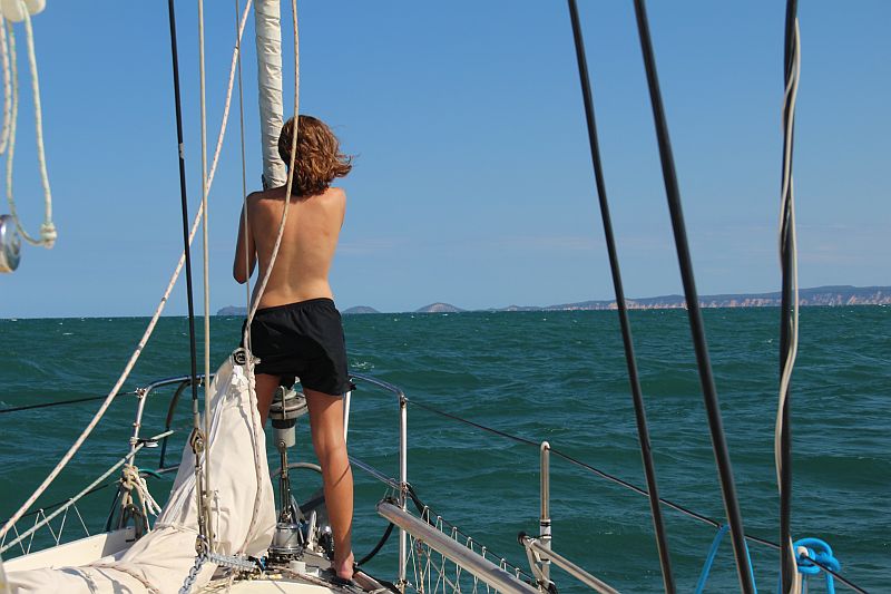 The water was shallow and the seas were VERY bouncy, with Ocean Child's nose diving completely into the water, and at the other end, the propeller coming completely out of the water. Anna loved it, standing right at the tip of the bow..