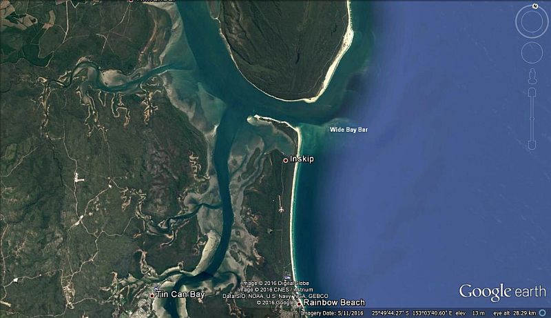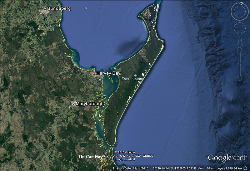 As you can see from these images, the channel between Fraser Island and the mainland is very shallow, with many large sandbanks. This water is known as the Great Sandy Strait, and in its south exit opens onto Wide Bay. Extensive areas of mangroves line the channels... great habitat for young and small fish. Fraser Island itself is mostly protected by national park status.