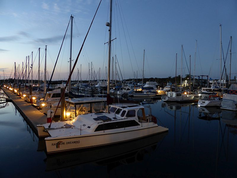 Tin Can Bay (Queensland) to Yamba (NSW) Ocean Child settled in at Bundaberg Port Marina. A quiet, friendly marina. The city of Bundaberg, about 20 minutes drive away, has a great Sunday market, where we bought fresh fruit and vegetables, and I succumbed to bad habits, and bought three second-hand tools (good German and Swedish steel... very expensive to buy these days... well, that was my excuse). And of course I drank a lot of my favourite soft-drink, Bundaberg ginger beer. Anna (Denmark) arrived on October 6, and Ky (Germany) arrived on October 15. We set sail on October 16, heading south into Hervey Bay, Unfortunately for us, the humpback whales who frequent Hervey Bay over winter had already departed on their journey south.