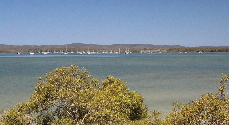 Below is typical of the landscape around the small towns of Tin Can Bay and Cooloola Cove. Hills formed from ancient sand dunes, shallow tidal waters lined with mud flats and mangroves, and lots of sheltered anchorages for small boats. The mud flats provide habitat for migratory waders, crabs, shell fish, and small schooling fish like mullet.